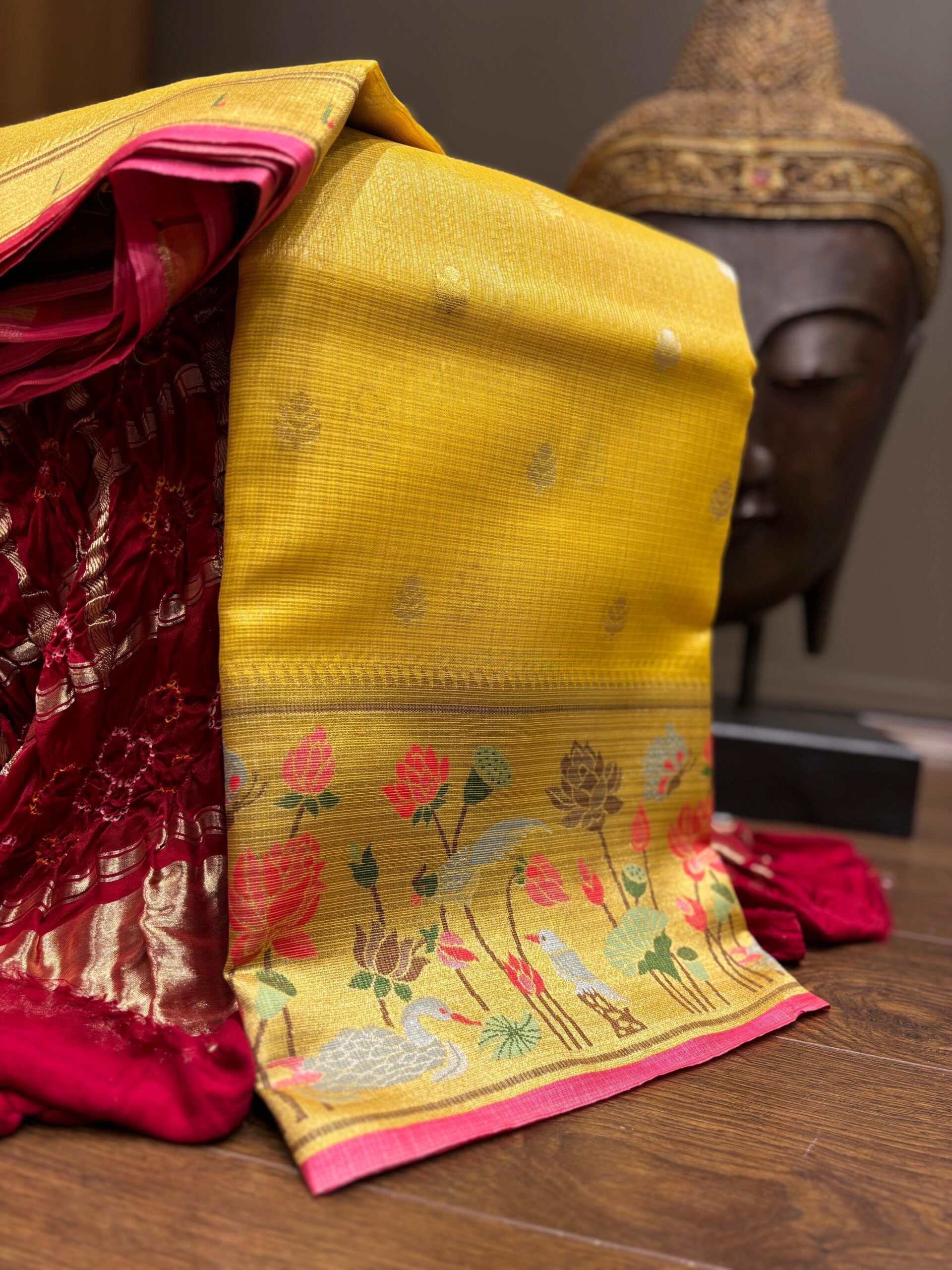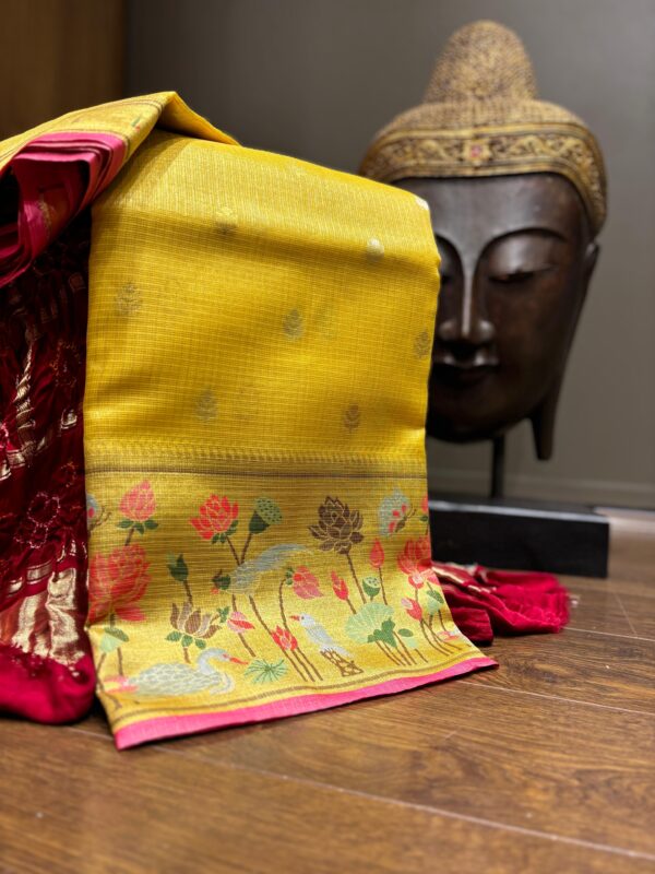 GAURANGI TRENDS is offering you a good looking KOTA saree in MUSTURD COLOUR with an all-over floral zari border, adorned with a delicate bird of Rs 4995/- in just Rs 3495/-